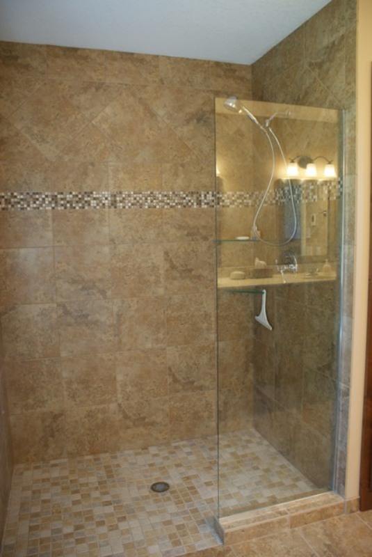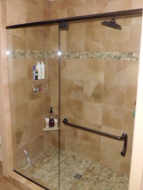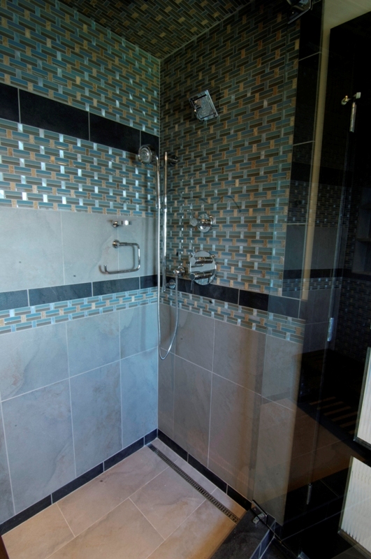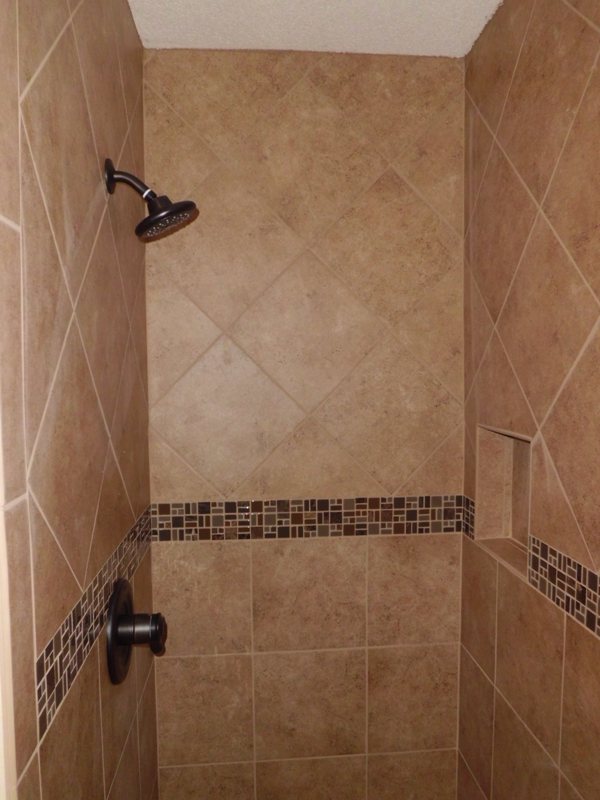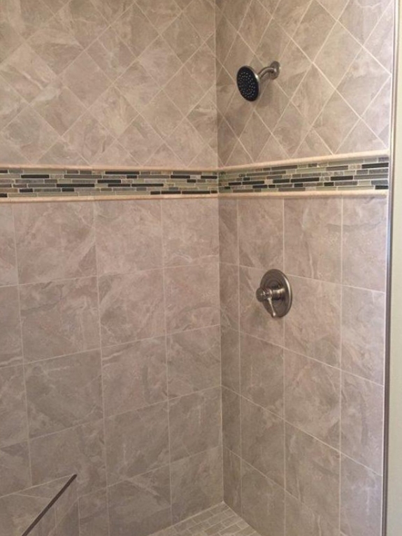 Tiling the walls up to the ceiling is wise as it prevents issues with water/moisture. Similarly if the bathroom has a lower ceiling, we recommend tiling the ceiling. Cleaning the shower is easy because we use Power Grout, which is stain resistant. You can also customize your tiled shower with multiple shower heads, grab bars or rainshower showerhead. Pair the tiled shower with a glass door and the shower really becomes a focal point of the bathroom. Below are a few of our tiled shower projects.