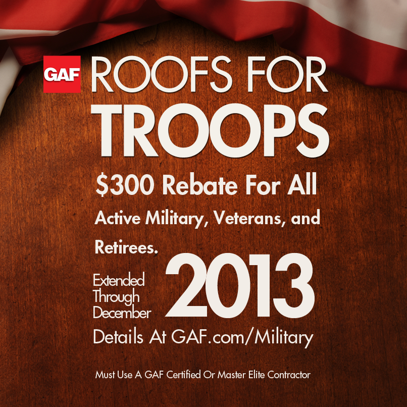 GAF Roofing is offering a rebate to the brave men & women of the U.S. Miliatry through its “Roofs for Troops” program.