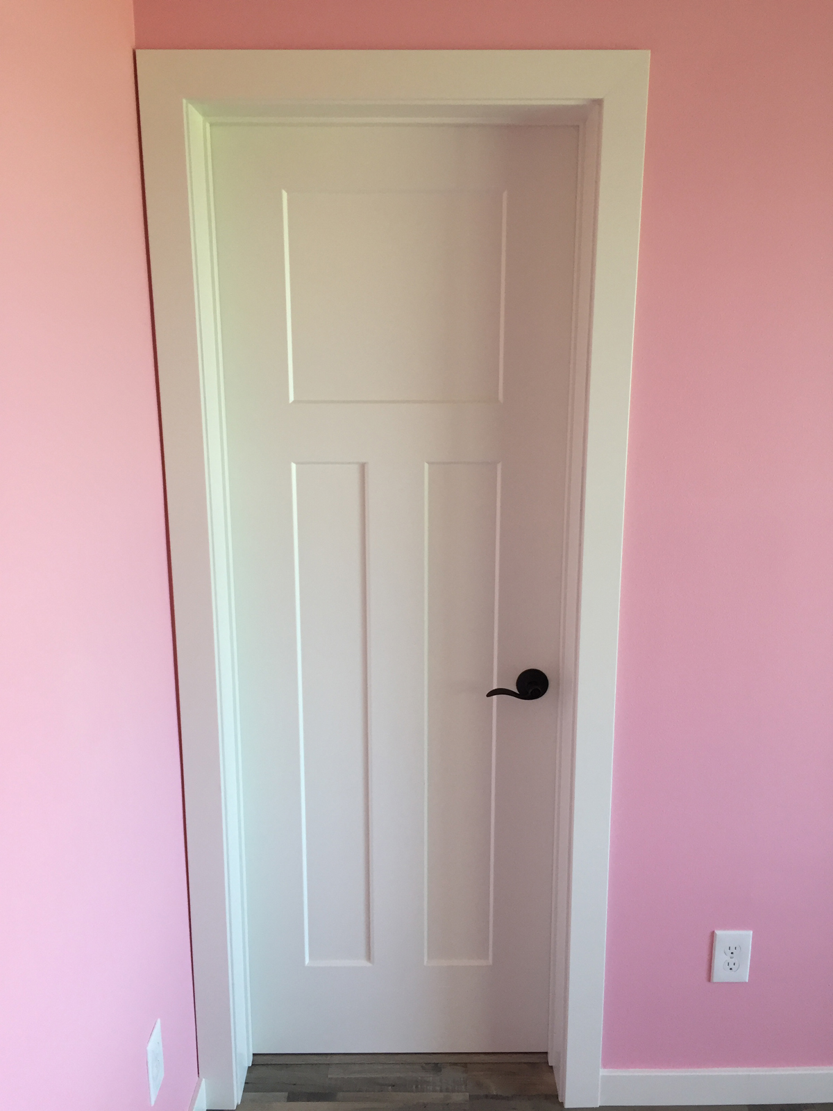 The next step is putty the nail holes – you want the putty to be flat or level with the casing, no indent. A second coat of paint is then applied to the casing and door frame; creating a nice, clean finished look.