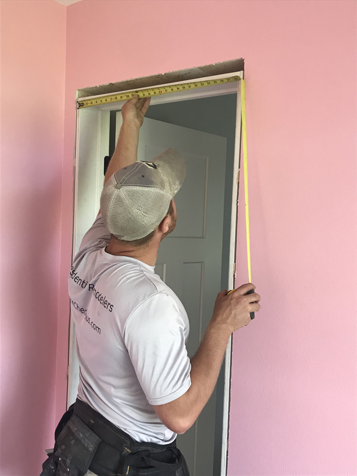 After the top casing is installed, the next step is to measure the sides. For hard flooring materials (vinyl, wood, etc), the casing is installed after the flooring. Whereas with carpet, the casing is installed before, so when measuring it is key to allow for the thickness of the carpet.